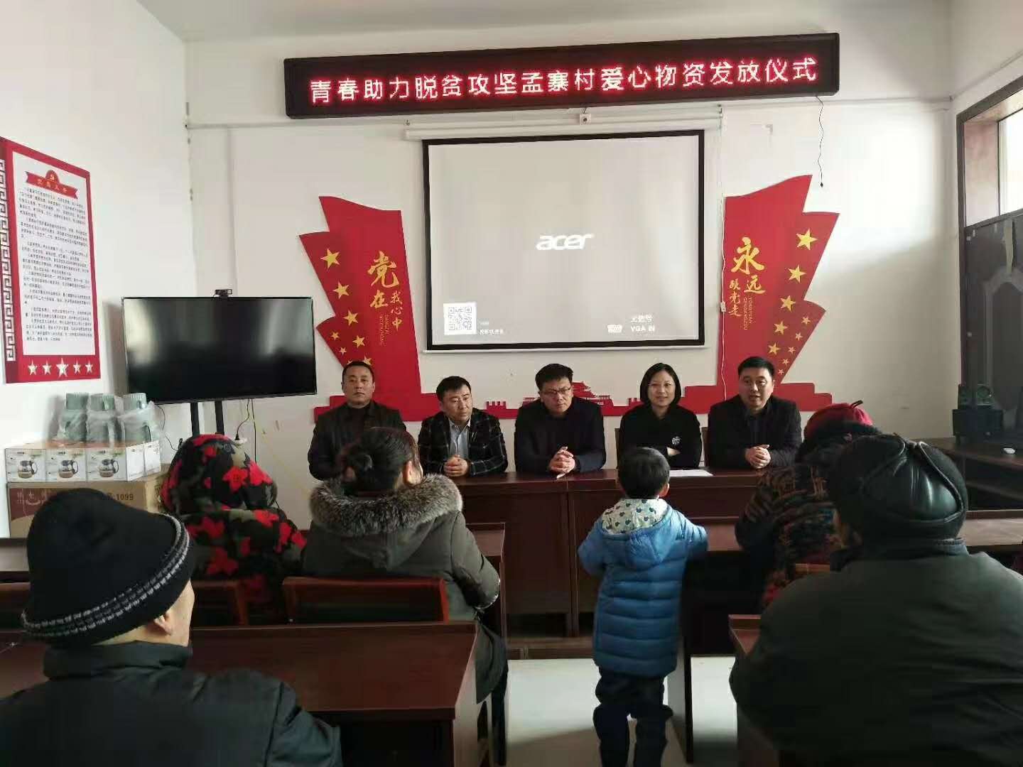 2019年3月3日上午,舞阳团县委在孟寨镇孟寨村举行“青春助力脱贫攻坚孟寨村爱心物资发放仪式”。团县委书记李静,孟寨镇镇长罗中兴,孟寨镇人大主席康岸毅 省派驻村第一团支部书记、漯河市天衡机械有限公司总经理王华锋代表公司出席仪式。孟寨村村两委干部、第一书记及村民代表参加了仪式。